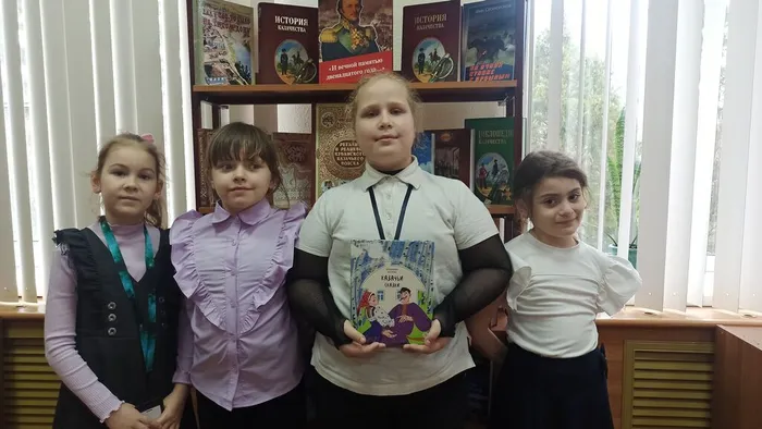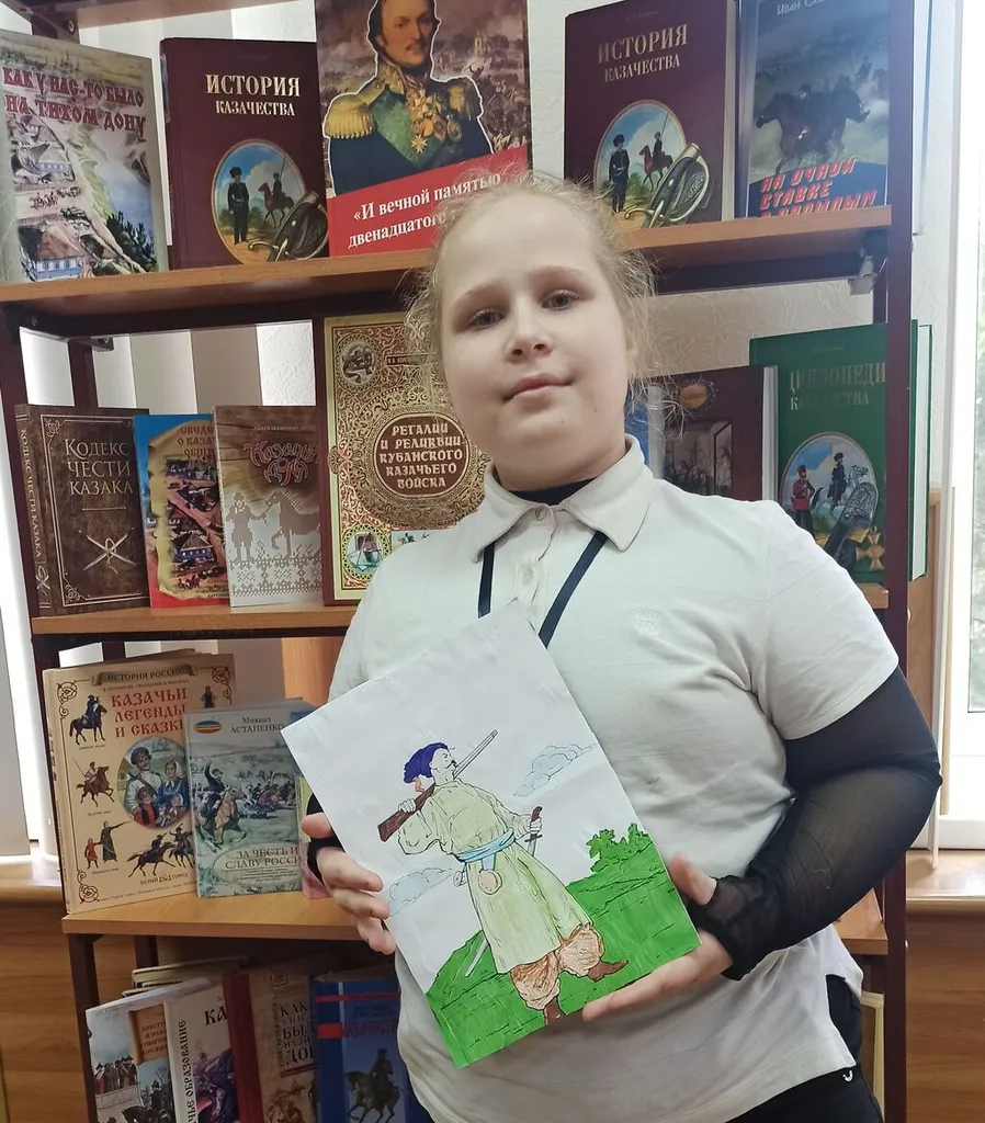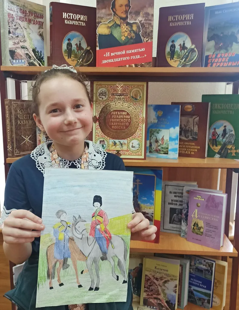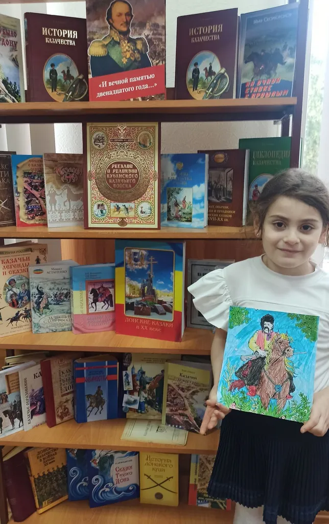 Здесь ребята отправились в путешествие по страницам истории родного края. Юных читателей познакомили с книжной выставкой «Атаман Платов — известный казак», рассказывающей о легендарном герое и его подвигах.